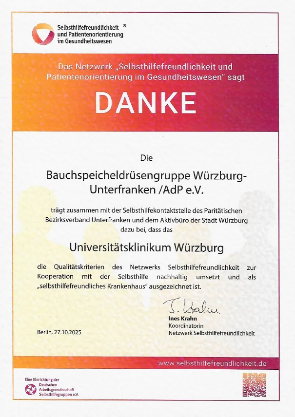 Diese Wiederauszeichnung ist nicht nur eine Bestätigung für das Uniklinikum, sondern ein herausragendes Zeugnis für die Wirksamkeit und das Engagement unserer Gruppe, der Selbsthilfegruppe für Bauchspeicheldrüsenerkrankte Würzburg-Unterfranken (AdP e.V.). Denn der Titel belegt, dass die Anliegen und die wertvolle Perspektive der Betroffenen fest im Klinikalltag verankert sind – maßgeblich mitgestaltet durch unser Einbringen.